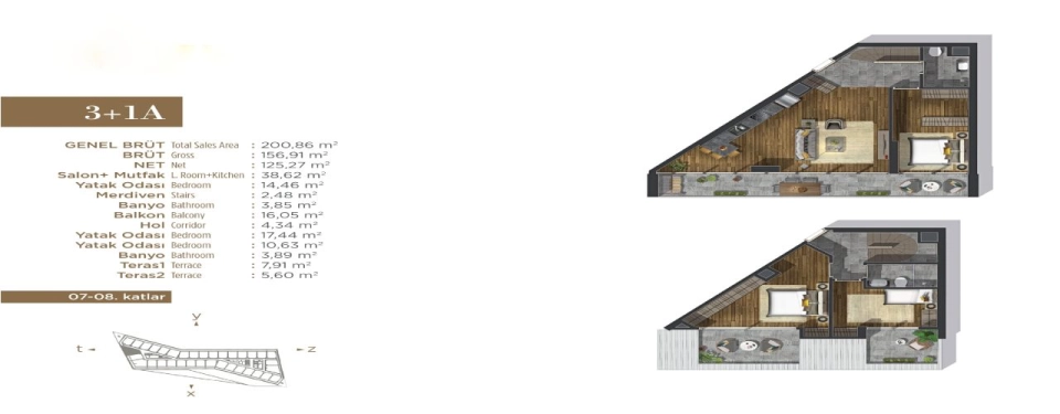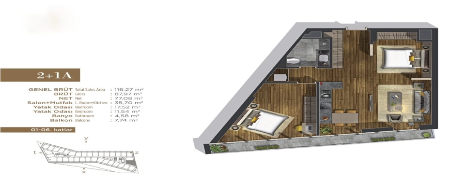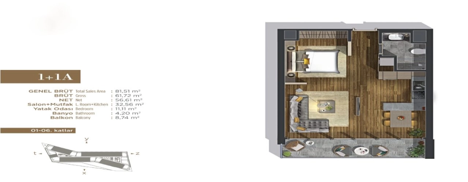 تم بناؤه على مساحة 7.000 متر مربع، يضم 245 شقة سكنية من أنواع 1+1 و 1+2 و 14 مكتبًا وبناء من 7 طوابق يتضمن 20 متجرًا من أشهر العلامات التجارية.