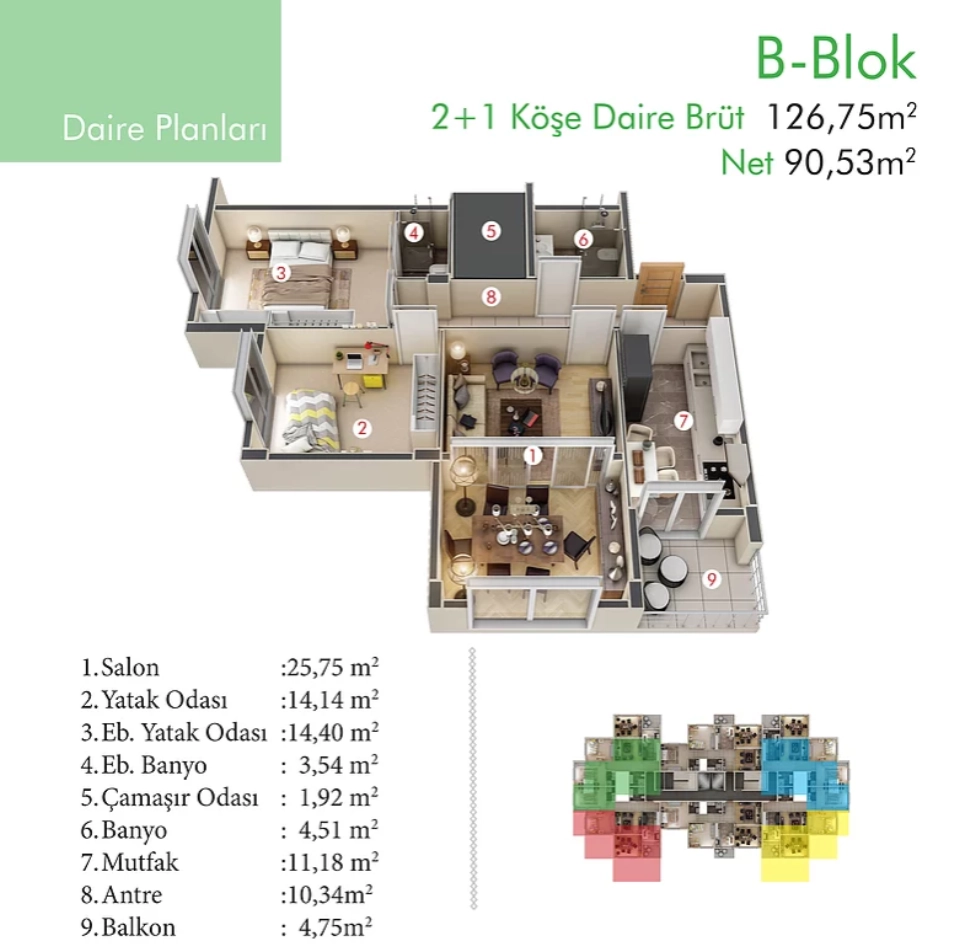 این پروژه در 4 بلوک و 198 آپارتمان برای کاربری مسکونی ساخته شده است. آپارتمانها 2+1، 3+1 و 4+1 هستند
