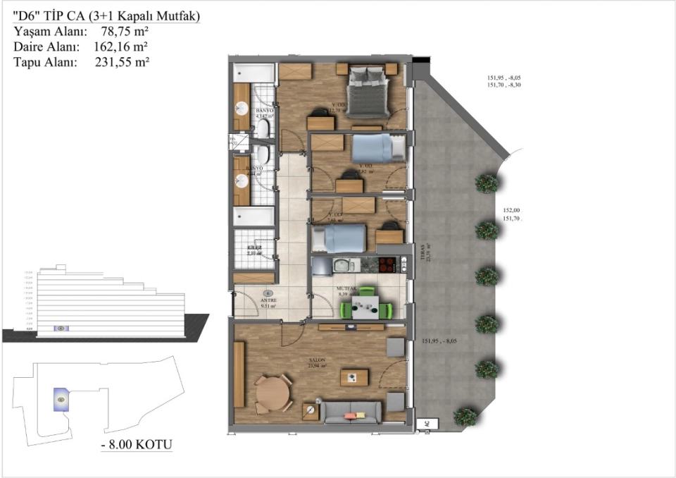 | Type | Yatak Odaları | Area m² | Fiyat |