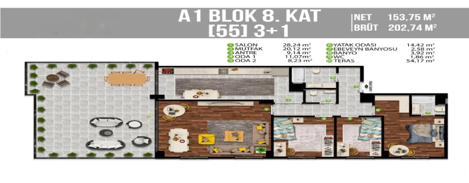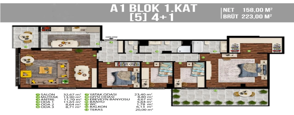 | Type | Yatak Odaları | Area m² | Fiyat |