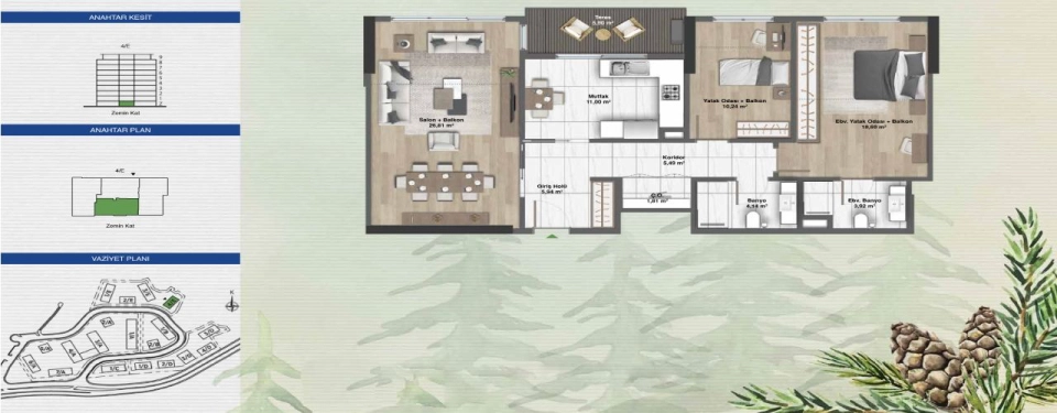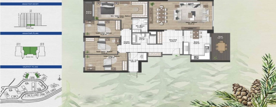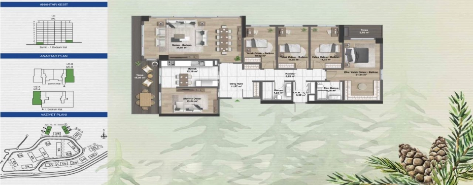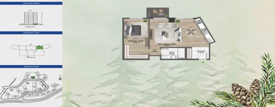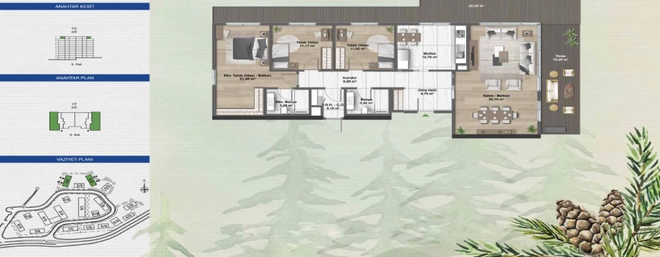 | Type | Yatak Odaları | Area m² | Fiyat |