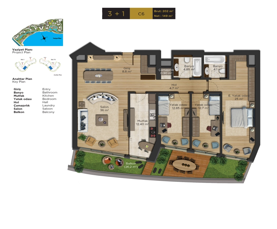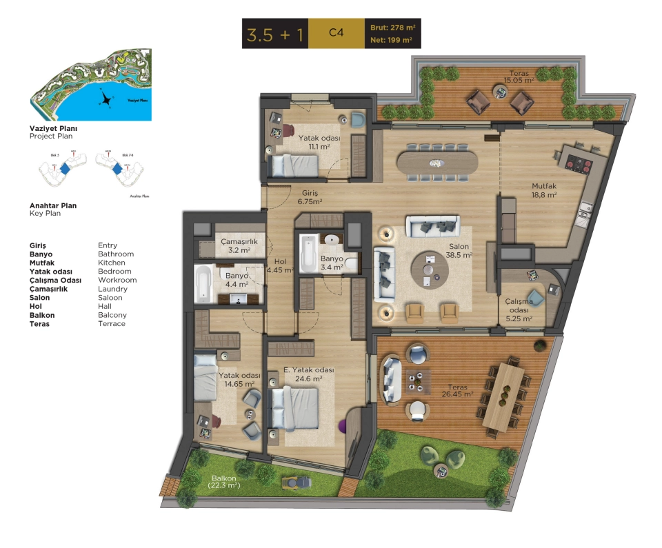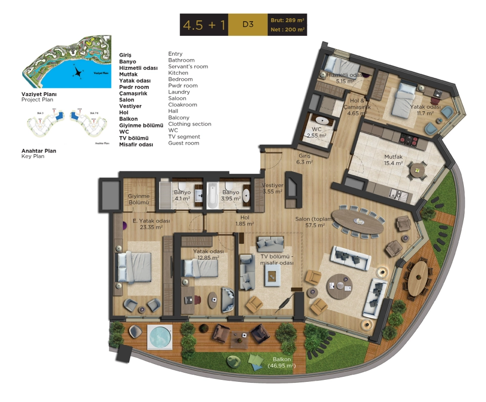 - 33.000 m2 yeşil alana sahip bu daire Osmanlı dönemi konseptinde inşa edilmiştir, bu projenin sakinleri bu bahçede yürüyebilir ve tertemiz deniz havasını içinize çekerek İstanbul'da çok lüks bir yaşamın tadını çıkarabilirler.