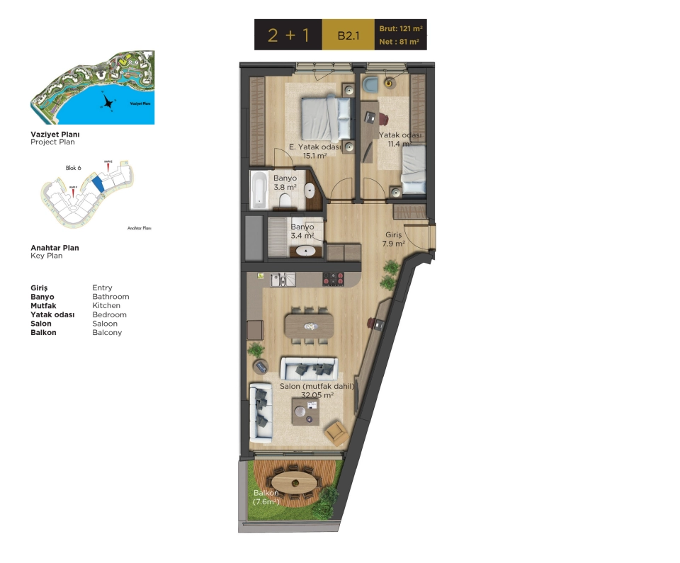 | Type | Yatak Odaları | Area m² | Fiyat |