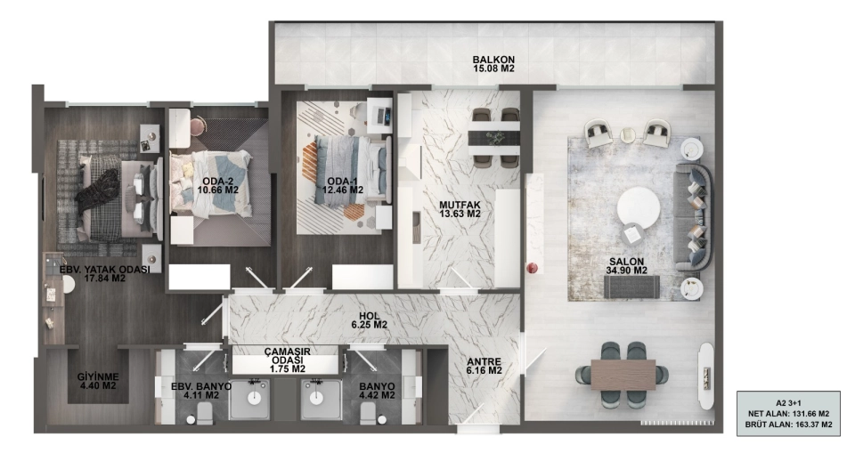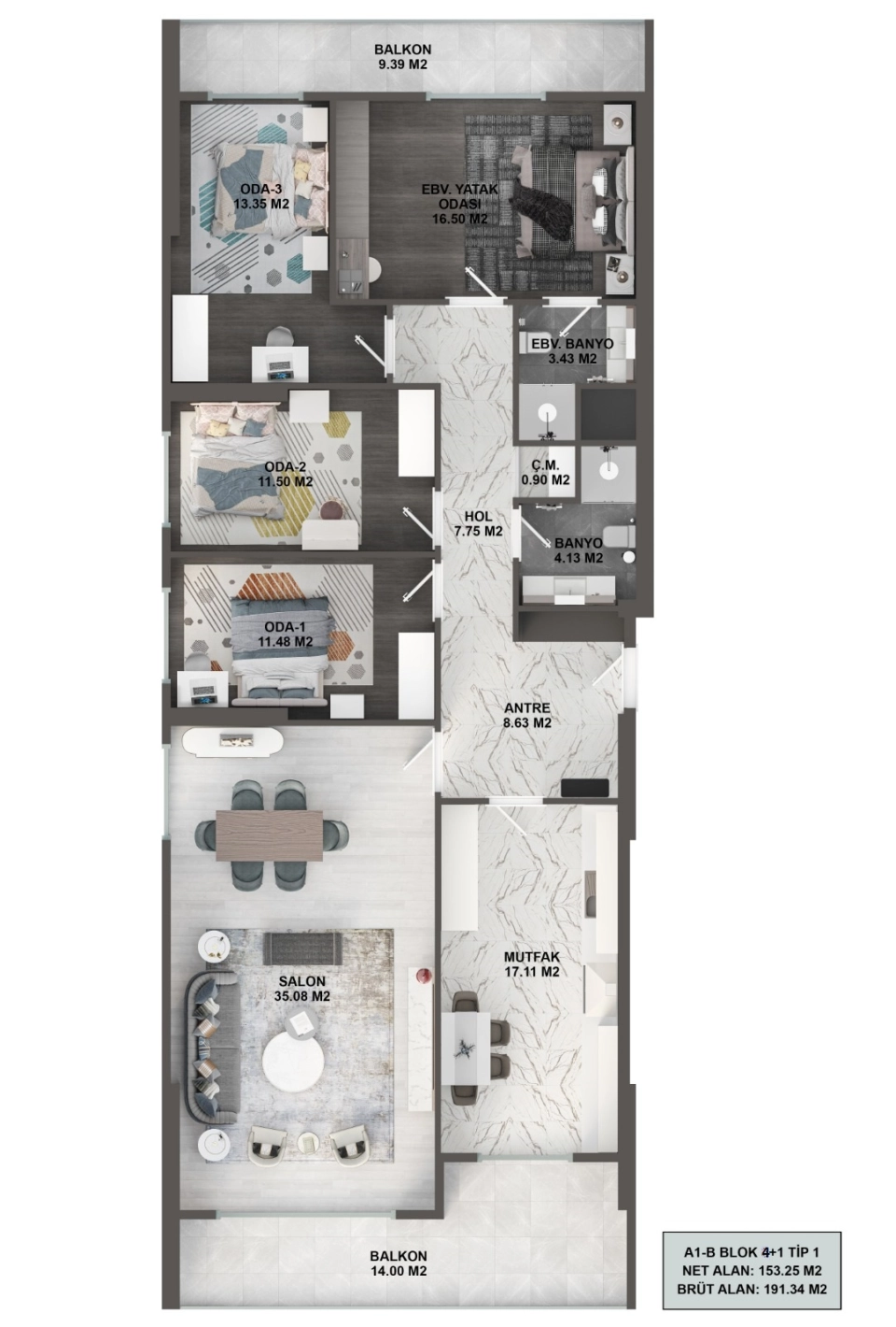| Type | Yatak Odaları | Area m² | Fiyat |